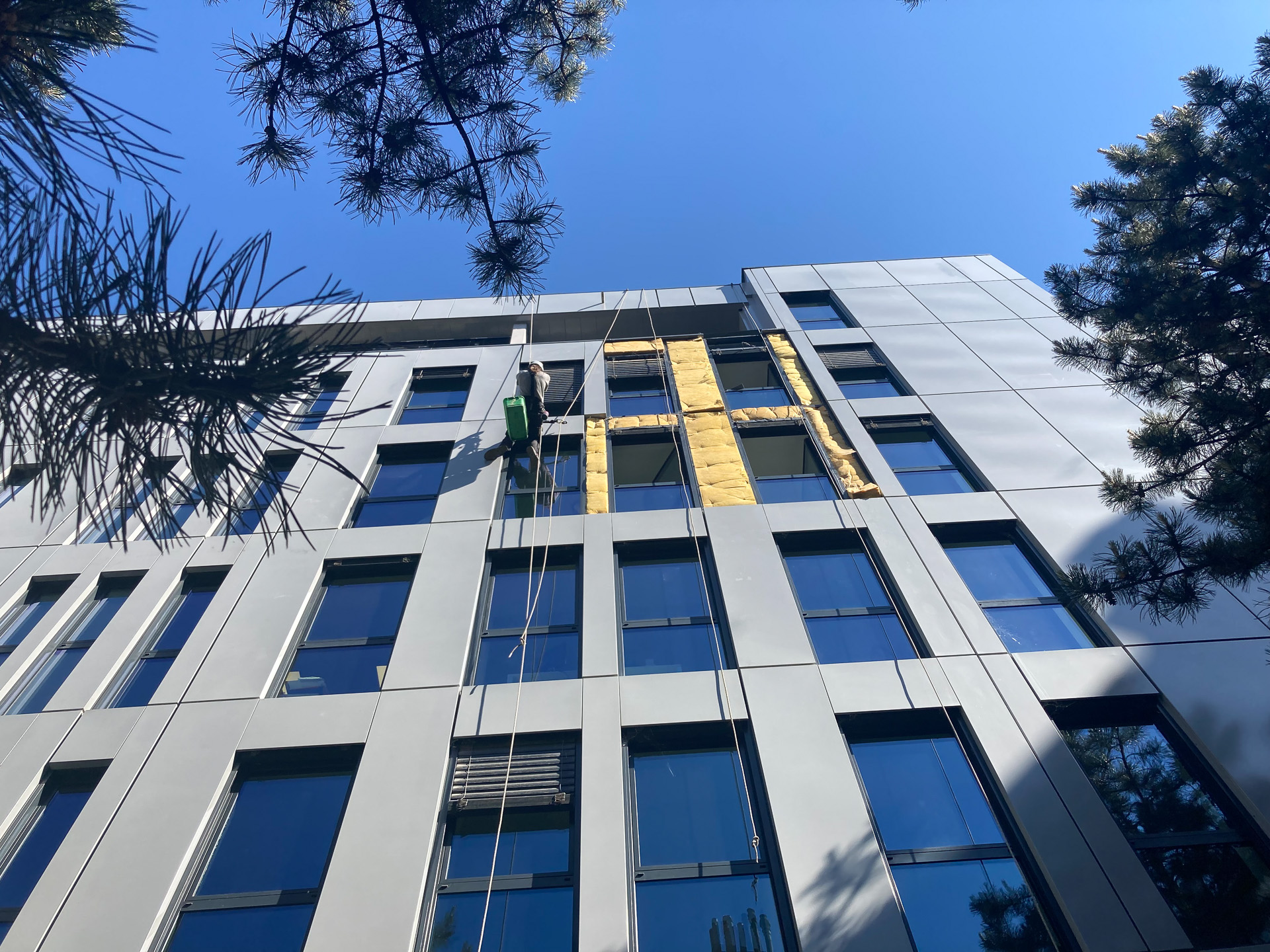 Une équipe de deux techniciens cordistes est intervenue à Lyon pour le suivi de l’étanchéité en pourtour du précadre de fenêtres, après la dépose de la couvertine chapotant la tête du bardage ainsi que les cassettes métalliques présentes à l’aplomb et autour des châssis. Après la mise hors d’eau ils ont réinstallé les cassettes et nettoyé façade et vitres en périphérie du secteur d’intervention.